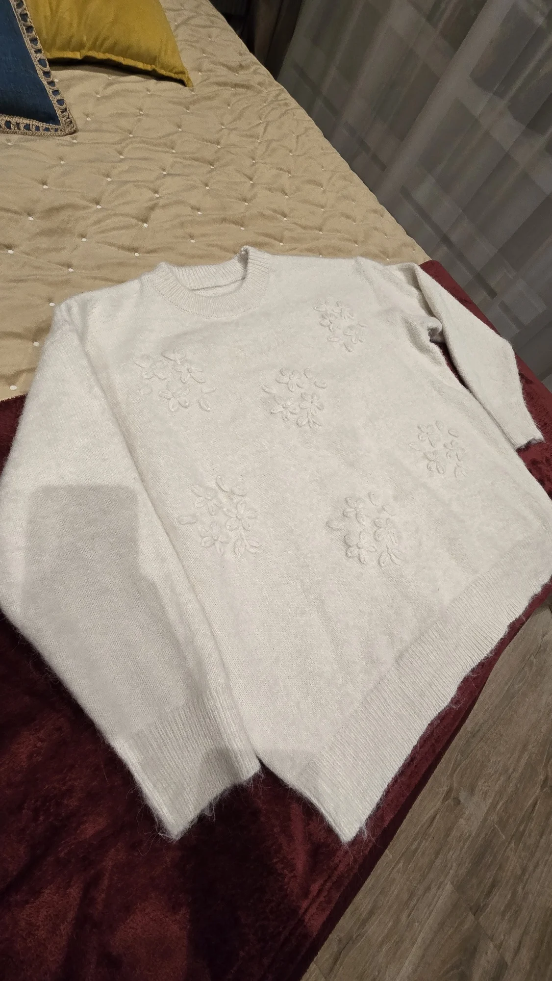 Dans l'ensemble, le pull est correct. La composition est bonne, il contient même de la laine. Mais j'ai été déçu par la couleur. Sur la photo, elle est doucement laiteuse, mais en réalité, elle a une teinte grisâtre, comme si elle avait été délavée. La taille L convient comme un surdimensionné pour une taille de 168 cm et un poids de 65 kg. Si vous voulez une coupe plus ajustée, prenez la taille M. La longueur des manches est parfaite.